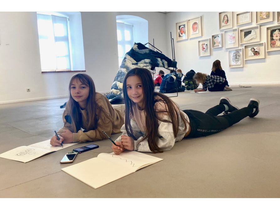 In der kurzen Führung durch die Ausstellung erklärte Kunstlehrerin Simone Seifert die wichtigsten Infos und Details zu den Kunstwerken. Spontan entstanden schnelle Zeichnungen ausgewählter Werke, die die 5. KlässlerInnen in ihrem Skizzenheft festhielten und als mögliche Idee für ein eigenes Kunstwerk nutzen können.