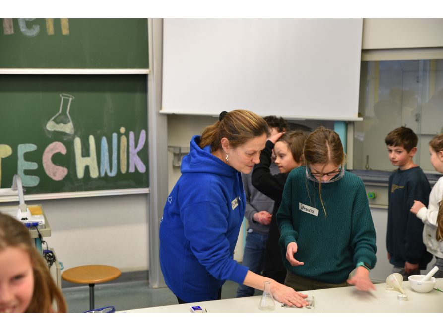 Am Donnerstag, den 1. Februar 2024 öffnete der Ganztagsbetrieb seine Türen. 64 Kinder konnten sich zusammen mit ihren Eltern ein Bild von der gebundenen und offenen Ganztagsschule machen. Während die Eltern bei einem Elterncafé von Sigrid Schiedermeier und Stephan Magerl über die Strukturen und den Ablauf der Ganztagsklasse informiert wurden, durften die Viertklässler gemeinsam mit Max Drexler verschiedene Stationen im Schulhaus durchlaufen. Dabei lernten sie mit tatkräftiger Unterstützung der Ganztagsklasse 5b und Frau Habler den Fachbereich Natur und Technik kennen und führten ein erstes Experiment durch.