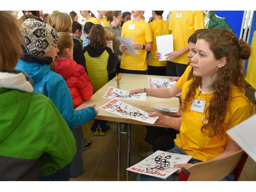 Währenddessen hatten die Viertklässler die Möglichkeit, zusammen mit den Tutoren in Kleingruppen das Schulhaus zu erkunden. So konnten sie bereits vorab einen Eindruck davon gewinnen, was sie an diesem Tag erwartete und wo sie die Sticker für ihren Fraunhofer-Dalmatiner sammeln konnten. In den einzelnen Fachbereichen gab es dann verschiedene Workshops, Vorführungen und Experimente. Die Bläser- und Chorklasse sowie die Streicherklasse stellten sich in einem kleinen Konzert vor, in den modernen Fremdsprachen gab es verschiedene Spiele und Workshops und die Chemiker präsentierten in mehreren Shows spektakuläre Experimente.