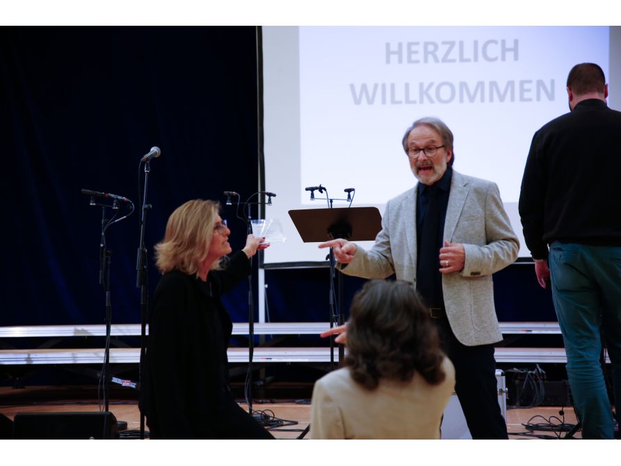 Fördervereinsvorsitzender Christian Nowotny bedankte sich bei allen Teilnehmenden mit einem Geschenk für die großartigen Leistungen (alle Künstler waren ohne Gage aufgetreten) und beim Publikum für das große Interesse, die hervorragende Stimmung und den tosenden Applaus. Hauptakteur Toni Lauerer erhielt als Weißbier-Liebhaber ein Weißbierglas, gefüllt mit Pralinen, im 3 D-Druck von Vorstandsmitglied Martin Brockelmann, Sohn von Toni Lauerers ehemaligem Sportlehrer, zur Erinnerung an diesen Abend extra angefertigt.