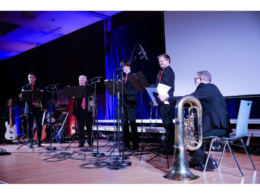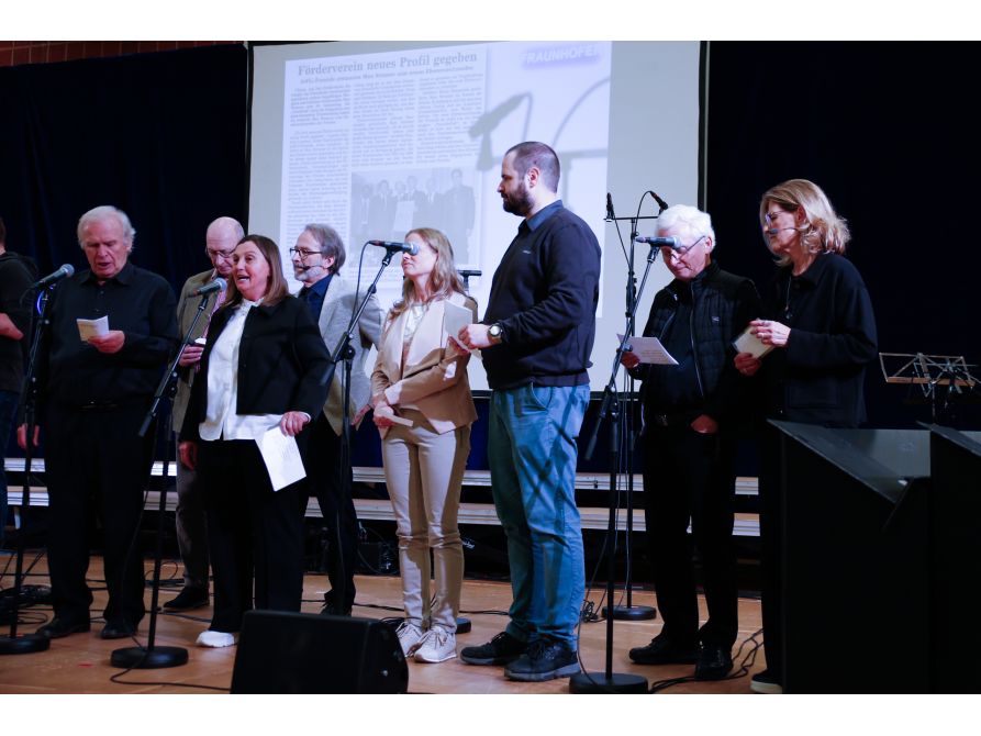 Schon nach dem Einlass um 18.00 Uhr lief auf einer großen Leinwand in Endlosschleife eine PowerPoint-Präsentation mit Informationen zum Förderverein der FRAUNHOFER-Freunde, bevor die Volksmusik-Band "Fünf auf Kraut", ebenfalls einige Ehemalige, die Veranstaltung pünktlich um 19.00 Uhr mit einem fetzigen Einmarsch auf die Bühne eröffnete. Sobald die ersten Töne der vier Bläser und des Akkordeonisten erklangen, klatschte das Publikum begeistert mit, bis zum Ende des Abends gelang es der Formation immer wieder erneut, das Publikum so richtig anzuheizen.