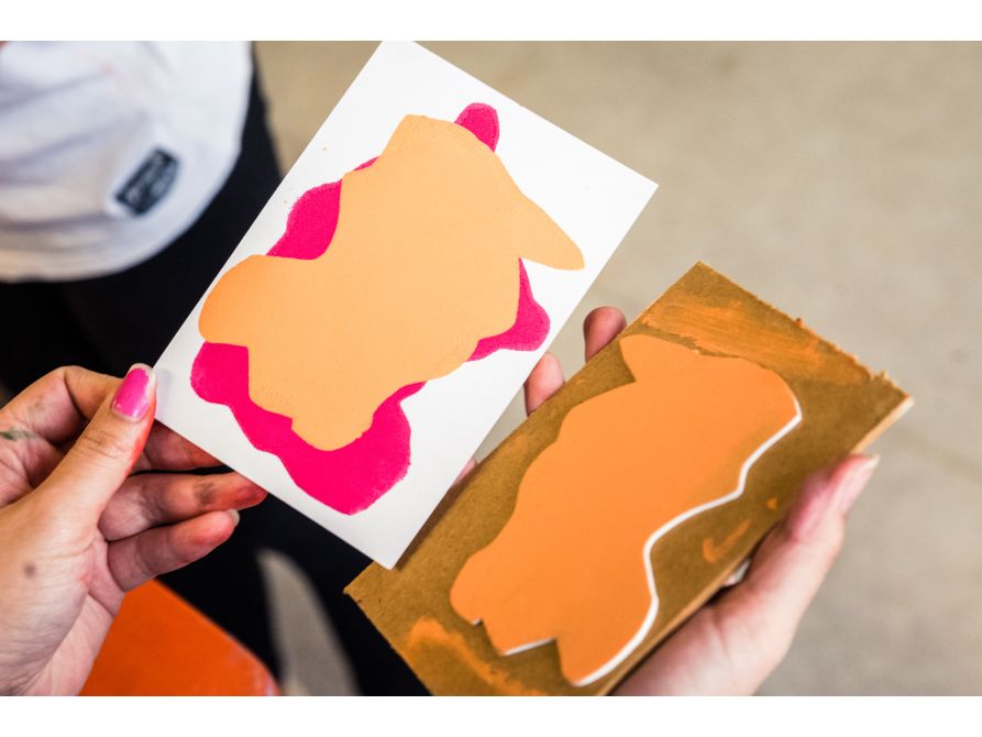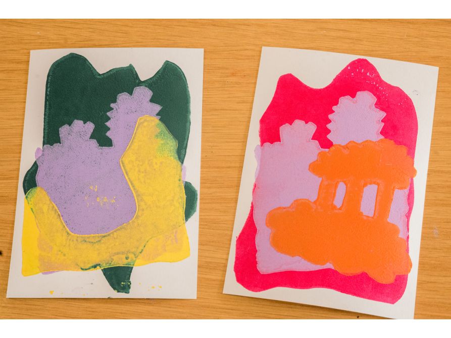 So galt es auch an diesem Tag zunächst die eigene Idee unserer Landschaft in Form von Skizzen zu visualisieren. Der Blick aus dem Fenster machte für Alle die typischen Oberpfälzer Landschaftsformen sichtbar. Aufgeteilt in Hinter-, Mittel- und Vordergrund wurden Formen entworfen, die den verschiedenen Landschaftsebenen entsprachen. Hügel, Berge, Baumkronen, Wiesen, Felder, Seen, Bachläufe bis hin zu Steinen und Blumen mussten in eine reduzierte Bildsprache gebracht werden, um später in Moosgummi ausgeschnitten werden zu können. Der Moosgummi als Druckstempel konnte anschließend farbig auf Papier in Postkartengröße gedruckt werden. Da insgesamt pro Papier vier Ebenen geplant waren, durfte sich jeder Schüler an den Druckstöcken der anderen bedienen, um letztendlich seine Komposition zu erreichen. Ganz nebenbei wurde dadurch der Gemeinschaftsgedanke gestärkt und durch das mögliche Teilen der Fokus auf das Arbeiten im Team gelegt. Aufgrund der reduzierten Formensprache erzielten die Teilnehmer sehr wirkungsvolle und tolle Ergebnisse. Ein gelungener erster Projekttag, der Lust auf mehr machte.
