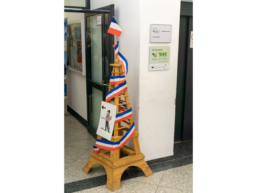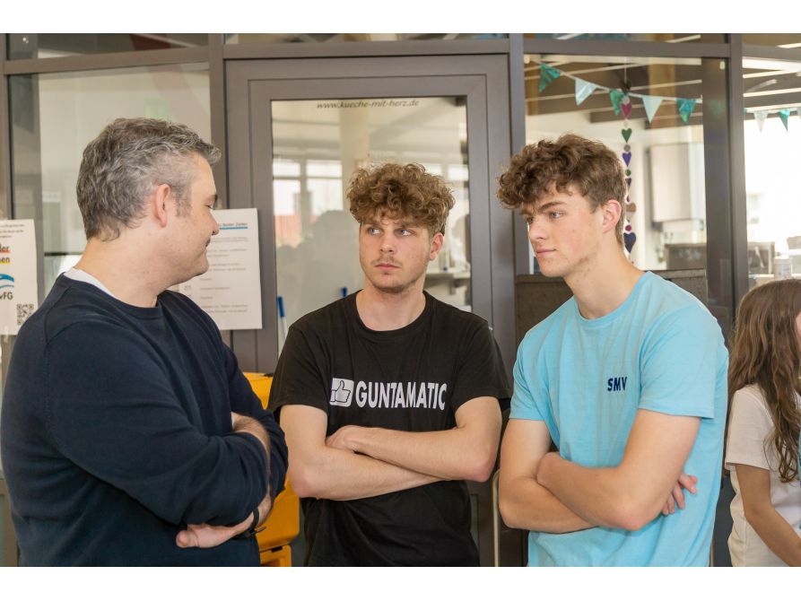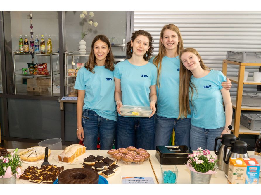 Auch für das leibliche Wohl war bestens gesorgt: Das von der SMV organisierte Kaffee- und Kuchenbuffet, sowie die Brotzeitstation mit warmen Leberkässemmeln und kühlen Getränken in der Pausenhalle lud zum Verweilen und Plaudern ein. Das P-Seminar „Schule ohne Rassismus“ steuerte kulinarische Spezialitäten aus aller Welt bei, während das Ganztagsteam beispielsweise frisches Popcorn und die Französisch-Fachschaft köstliche Crêpes anbot.