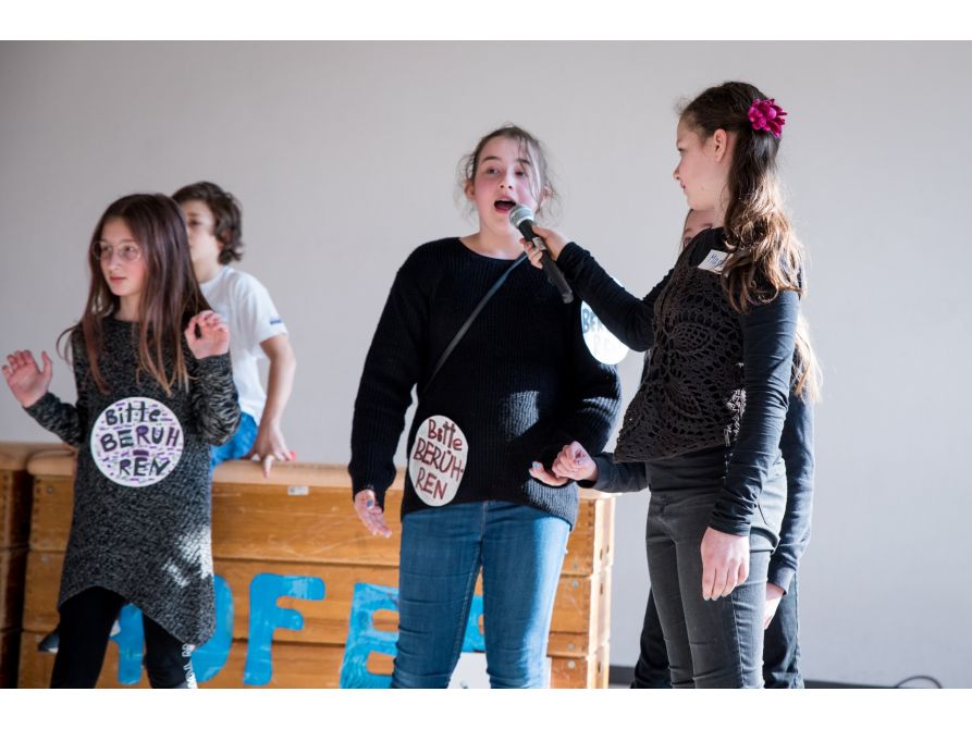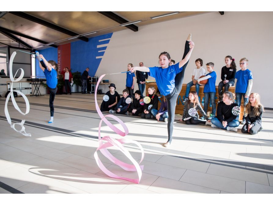 Schüler aus den fünften Klassen stellten zu Beginn in einem szenischen Spiel die ganze Vielfalt am Fraunhofer-Gymnasium vor. Der leidenschaftliche Fußballer Luca besucht die Fußballklasse und nutzt gleichzeitig das Angebot der Gebundenen Ganztagsklasse. Matthias hingegen ist in der Offenen Ganztagsschule, zusätzlich besucht er noch die Bläserklasse. Mara ist Mitglied der Kunstklasse, Marie geht in die Chorklasse. Doch damit nicht genug! Mitglieder der Theatergruppe unterbrachen die Unterhaltung der Fünftklässler als lebende Skulpturen und demonstrierten anschaulich, wie sie den Besuchern zu Informationen bezüglich der Schule verhelfen. Weiterhin demonstrierten die Sportler aus den Bereichen Basketball, Handball und Rhythmische Sportgymnastik das vielfältige sportliche Angebot am Fraunhofer. Die Unterstufenbetreuerin OStRin Habler stellte den Besuchern anschließend die Tutoren vor, die sich an diesem Tag im Besonderen um die Viertklässler kümmerten, und leitete dann mit ihrem eigenen ersten Fraunhofer-Zeugnis auf das Motto des Tages über.