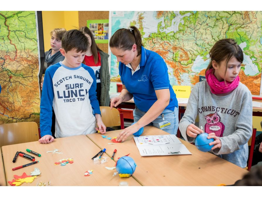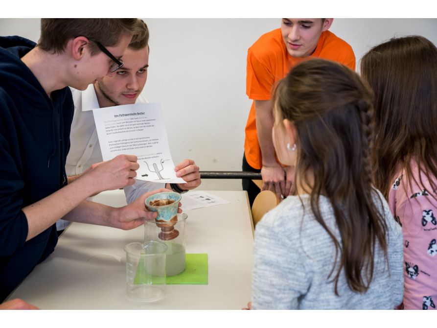 Damit die Viertklässler an diesem Zeugnistag nicht ohne Zeugnis nach Hause gehen mussten, durften sie für ihr eigenes erstes Fraunhofer-Zeugnis in alle Fachbereiche schnuppern. Dazu gab es für sie eine eigens gestaltete Fraunhofer-Zeugnismappe mit Zeugnis, auf dem sie Smiley-Sticker sammeln konnten. Waren mindestens vier von sechs Fachbereichen besucht, war das Zeugnis nach einer Unterschrift „gültig“ und die kleinen Besucher konnten sich zudem noch in der Pausenhalle eine Belohnung abholen. Doch bevor sich die Gäste selbständig auf Erkundungstour machten, waren die Eltern eingeladen, sich in der Mensa von Dr. Balk in einem bilderreichen und abwechslungsreichen Vortrag über die Vielfalt am Joseph-von-Fraunhofer-Gymnasium informieren zu lassen. Zeitgleich wurden die Viertklässler von Tutoren in Gruppen durch das Schulhaus geführt und konnten sich so schon einen ersten Eindruck verschaffen, welche Angebote und Workshops auf sie warteten. Dabei konnten sie natürlich den Tutoren auch Fragen stellen, etwa ob man in der Pausenhalle Fußball spielen darf oder ob die Lehrer nett sind.