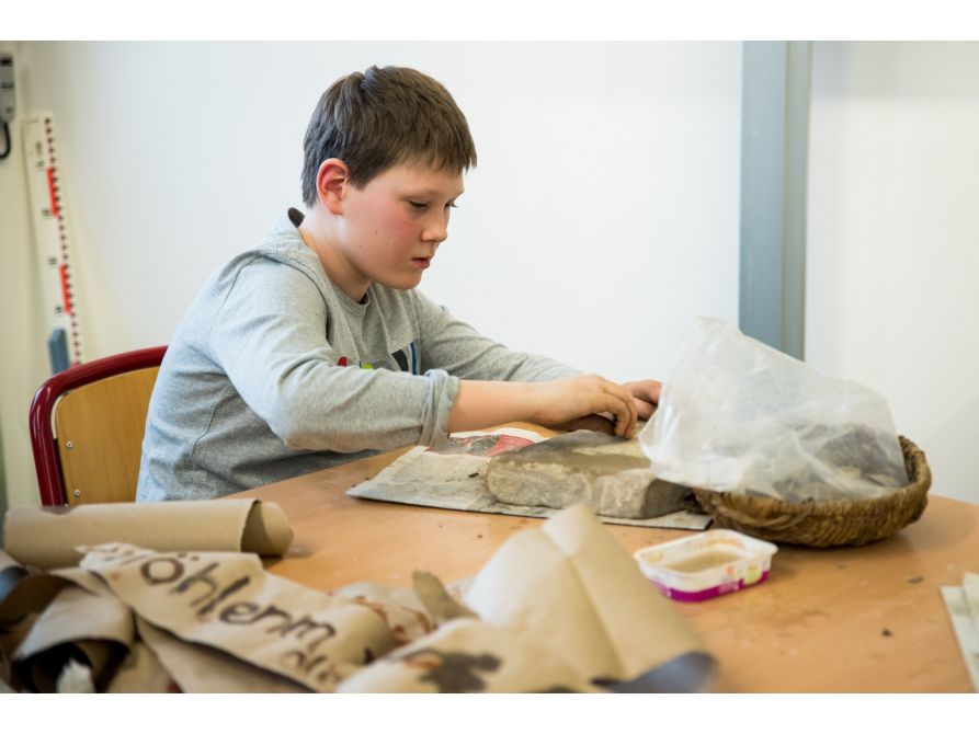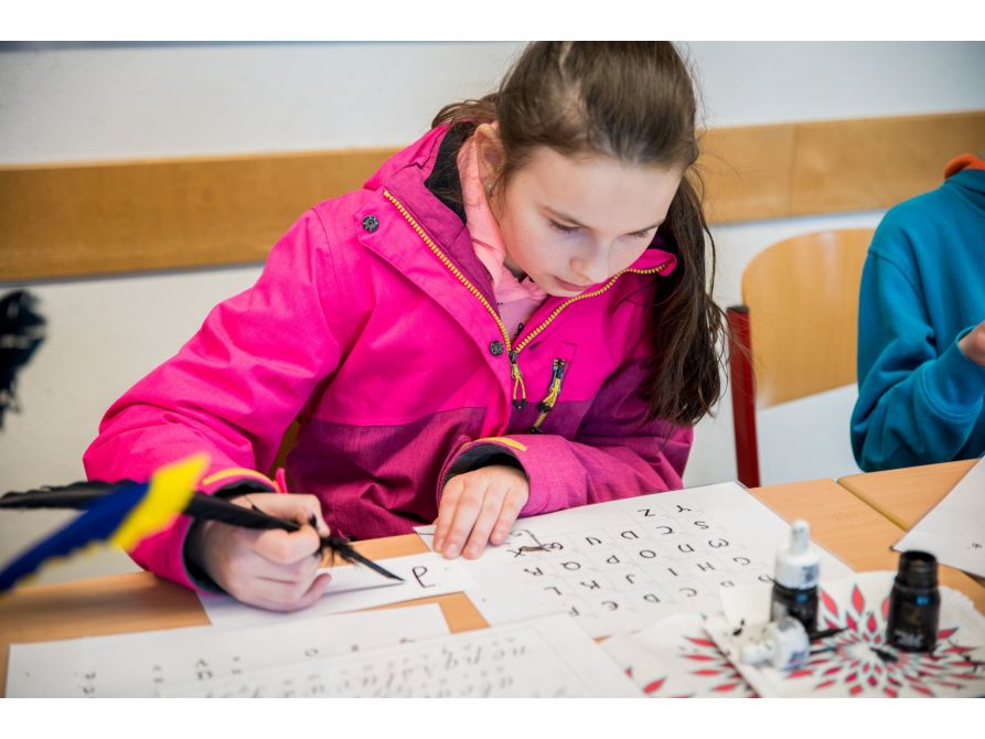 Mit einer Fraunhofer-Papiertasche und ihrer Zeugnismappe ausgestattet machten sich die kleinen Besucher schließlich in Begleitung ihrer Eltern voller Spannung auf in die verschiedenen Fachbereiche, erlebten verschiedenste Angebote und konnten die Vielfalt der Schule mit allen Sinnen erleben. So wanderten zum Beispiel im Wirtschaftsraum ein frisch gedruckter „persönlicher“ Geldschein und in der Kalligraphie-Werkstatt bei Deutsch ein selbstgestaltetes Lesezeichen in die Tüte. Wer schon immer mal Schmuck aus Muscheln basteln wollte, war im Steinzeit-Workshop richtig, und wer lieber eine Erdkugel gestaltete, blieb länger bei den Geographen.