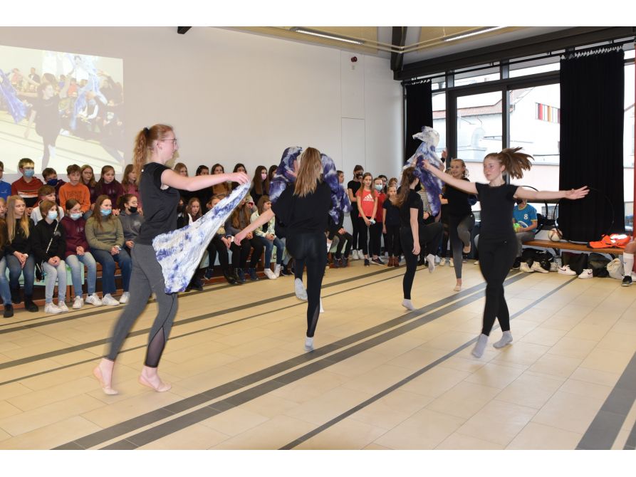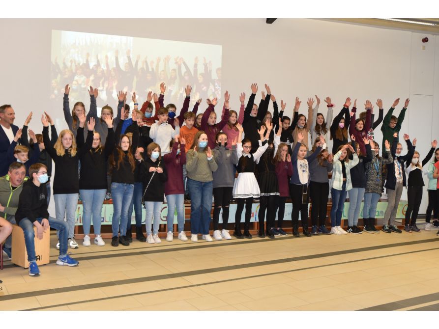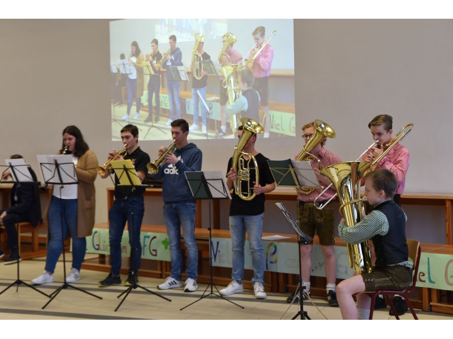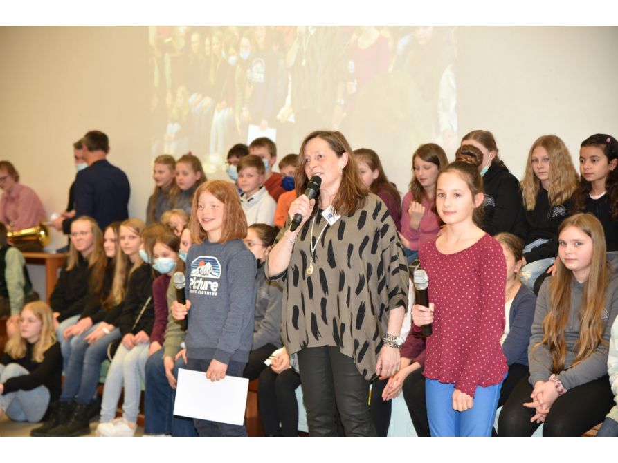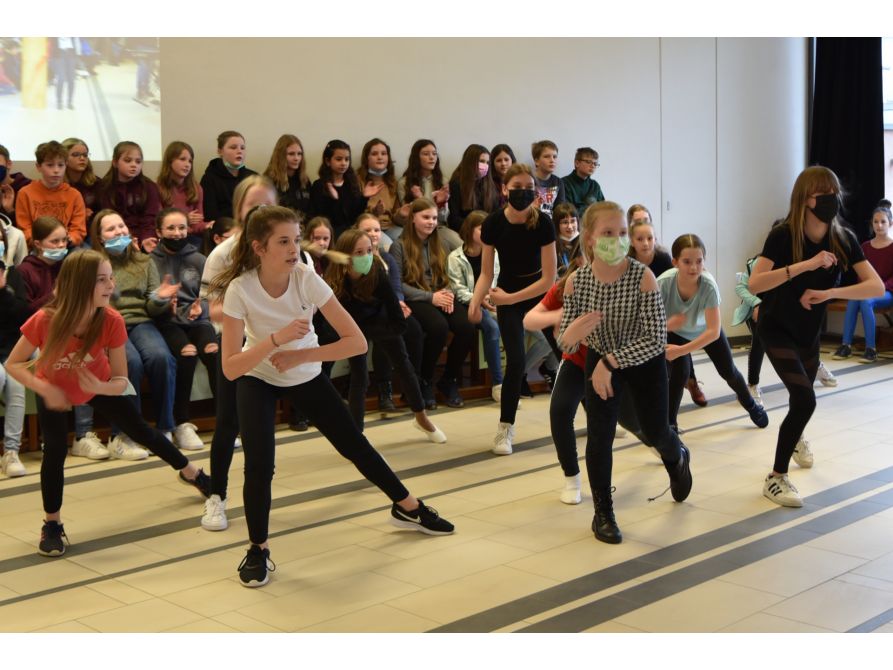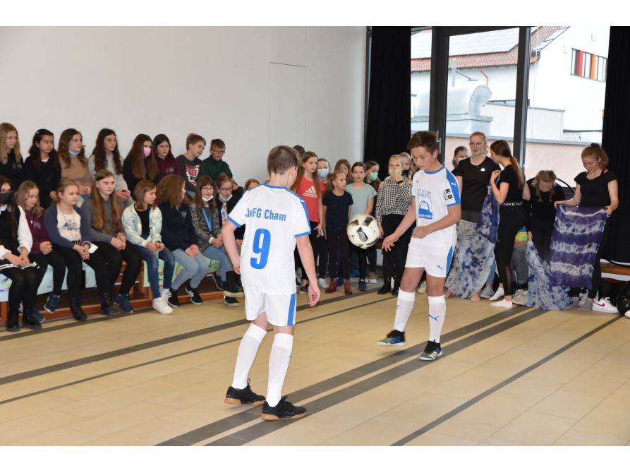 Begrüßt wurden die Gäste von der Jazzband, der Volksmusikgruppe und der Chorklasse 5, die mit einem eigens komponierten JvFG-Song die zukünftigen Fünftklässler willkommen hießen. Schulleiter Uwe Mißlinger und Unterstufenbetreuerin Birgit Habler stellten dann zusammen mit Ina Früchtl und Leopold Deglmann aus der 5. Klasse das Programm des Tages und die Schwerpunkte der Schule vor, während die Stützpunkte Fußball, Handball und Rhythmische Sportgymnastik bei mitreißender Musik eindrucksvoll ihr Können zeigten.