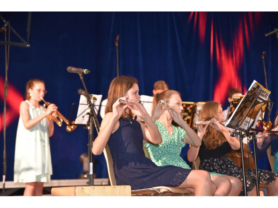 Im zweiten Teil das fulminanten Konzertabends jagte ein Höhepunkt den nächsten, denn nun zeigten die Ensembles mit vorwiegend älteren Schülerinnen und Schülern ihr Können. Mit Fanfarenklängen rief die Junior Band das Publikum zurück in den Saal und spielte dann „Shut Up and Dance“. Die Fraunhofer-Jazzband bewies anschließend, dass sie trotz der langen Corona-Pause nichts verlernt hatte. Mit „Man in the Mirror“, „Birdland“ und „Sing sing sing“ zeigte sie dem Publikum, was echten Bigband-Sound ausmacht.