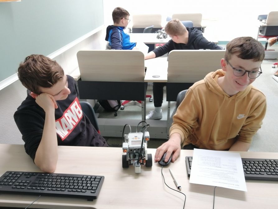Die Klasse 10c beschäftigte sich in den beiden Wochen nach den Osterferien mit dem Thema „Selbstfahrende Autos“. Jürgen Prasch, Abteilungsleitung TB26 Entwicklung Industriesoftware der Firma F.EE GmbH, Neunburg (F.EE steht für Fleischmann Elektrotech Engineering) hatte mit seinem Team ein kleines Projekt geplant, in dem NXT-Roboter mit der Programmiersprache C# über Bluetooth gesteuert werden konnten.