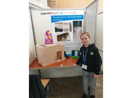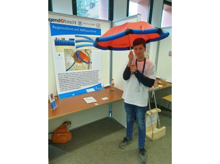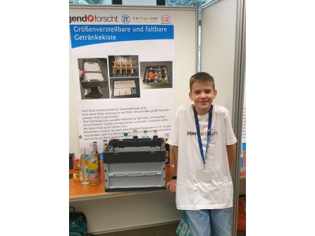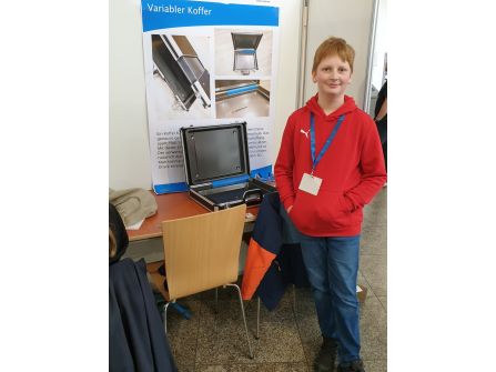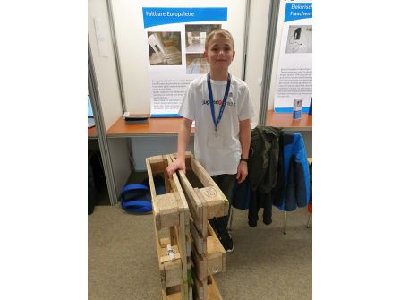 Mit seinem „Gehhilfenparkplatz“ löste Lukas Gruber aus der fünften Jahrgangsstufe ein Problem, das jeden betrifft, der auf Krücken oder einen Gehstock angewiesen ist. Möchte man die Gehhilfe kurz abstellen und lehnt sie dabei an eine Wand oder gegen eine Tischkante, so besteht die Gefahr, dass sie seitlich wegrutscht und zu Boden fällt. Genau dies wird verhindert, wenn man die Gehhilfe in dem von Lukas gebauten „Parkplatz“ abstellt. Darüber hinaus erhielt er auch einen von der Stadt Passau vergebenen Sonderpreis.