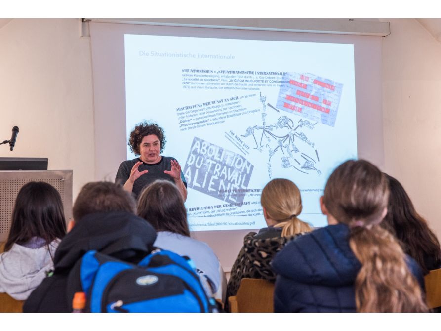 Die letzte Station an diesem Tag führte uns in die Städtische Galerie Cordonhaus Cham, wo wir nicht nur die aktuelle Ausstellung „Träume fliegen“ der Münchner Künstlerin Stefanie Unruh kurz besichtigten, sondern uns Zeit nahmen eine „Dérive“ durchführten. Darunter versteht man eine Technik, der täglichen Routine zu entkommen und Gewohntes aus neuen Blickwinkeln zu betrachten. Dafür durften die Schüler Anweisungen schreiben, die per Los verteilt wurden und von einem anderen Schüler ausgeführt werden mussten. In der Umsetzung standen Aquarellfarben zur Verfügung.