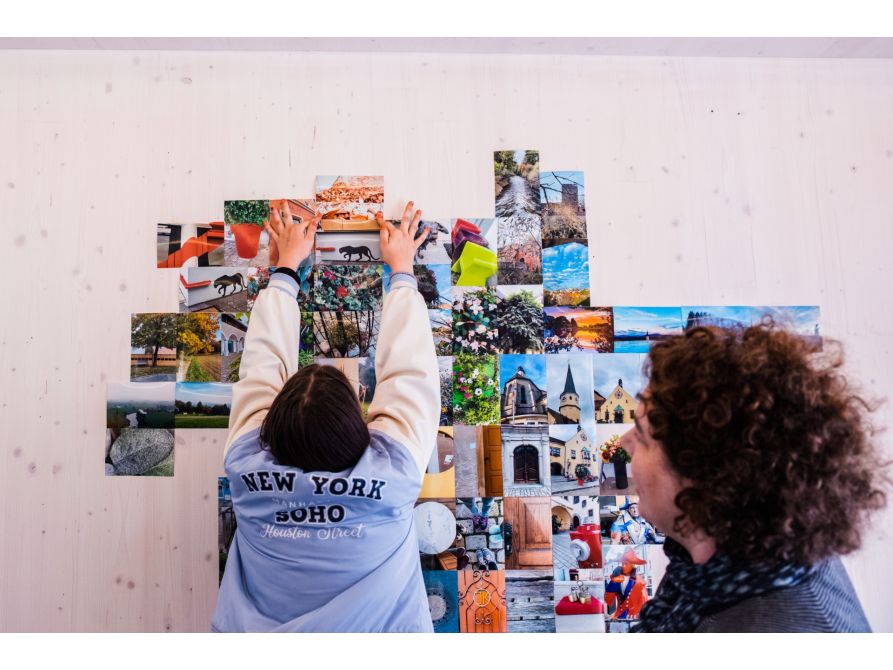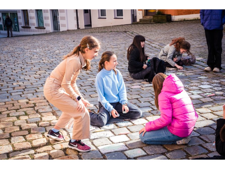 Während die Aufhängung der Fotos im mobilen Atelier stattfand, konnte auf dem Platz davor mit Straßenkreide gezeichnet werden und parallel dazu eine Idee aufgeschrieben werden, die eine Definition von Raum im Allgemeinen für jeden Einzelnen beschreibt. Letzteres kann ebenfalls in der Ausstellung im mobilen Atelier besichtigt werden.