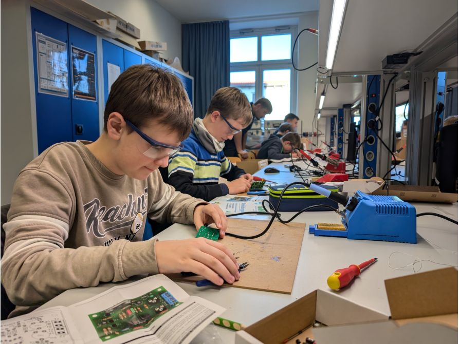 Bei einem LED-Lauflicht im Fortgeschrittenenkurs von Technik für Kinder können das ziemlich viele blinkende LEDs sein. Der Bausatz erfordert zur Montage einen erfahrenen Umgang mit dem Lötkolben. Eine ruhige Hand, ein regelbarer Lötkolben mit einer feinen Lötspitze und eine Pinzette sind Voraussetzungen für einen erfolgreichen Zusammenbau. Die Erfahrung brachten die 10 Schülerinnen und Schüler mit, die Werkzeuge lagen im Digitalen Labor der Schule bereit. Betreut wurden die Teilnehmer in gewohnt professioneller Weise von Auszubildenden der Firma Ensinger GmbH aus Cham, wobei sich ein Auszubildender jeweils um drei Teilnehmer kümmern konnte. Bei Problemen sind sie stets behilflich, weisen gegebenenfalls auf den gemachten Fehler hin oder führen vor, wie man an einer schwierigen Stelle optimal lötet.