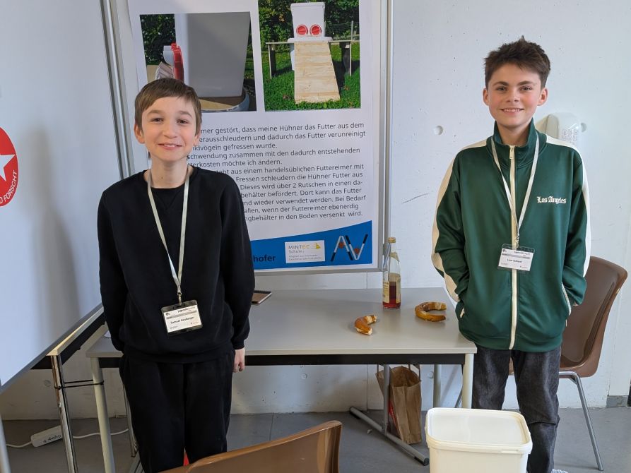 Den 2. Platz im Fachgebiet Arbeitswelt sowie den Sonderpreis Ressourcenschutz erreichte der innovative Fressplatz für Hühner von Samuel Heuberger und Luca Schmid (beide 6d). Die beiden hat es gestört, dass die Hühner das Futter aus dem Futtereimer herausschleudern und dadurch das Futter verunreinigt oder von Wildvögeln gefressen wurde. Diese Verschwendung zusammen mit den entstehenden hohen Futterkosten wird durch ihre Erfindung verhindert: Ihr Fressplatz besteht aus einem handelsüblichen Futtereimer. Bei ihrer Erfindung wird das herausgeschleuderte Futter über Rutschen in einen darunter liegenden Auffangbehälter befördert. Dort kann das Futter regelmäßig entnommen und wieder verwendet werden.