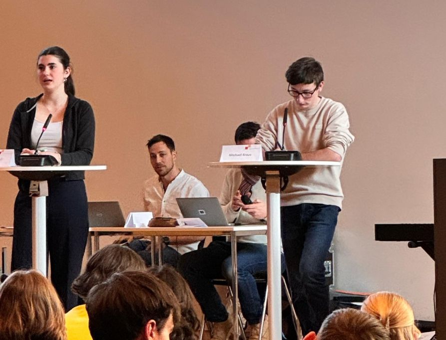 Für die vier Debattanten Lilly Straßburger, Leonie Straßburger (beide 10c), Harihaasini Radhakrishnan (11b) und Michael Kraus (Q12) ging es direkt mit der ersten Vorrunde der Debatte los. Als Juroren fungierten Anna Windmeißer (9a), Lukas Lommer (10d), Sophie Mühlbauer (11c) und Luzia Müller (11a). In der Sekundarstufe I (Klassenstufen 8 bis 10) ging es um die Frage: „Soll das Rauchen in der Öffentlichkeit verboten werden?“ und in der Sekundarstufe II (Klassenstufen 11 und 12) ging es um die Frage „Soll ehrenamtlich Engagierten ein staatlicher Zuschuss zum Führerschein gewährt werden?“. Nach 24 Minuten, aufgeteilt in Eröffnungsrunde, freie Aussprache und Schlussrunde, wurden die ersten Punkte verteilt und die Debattantinnen erhielten konstruktives Feedback ihrer Juroren.