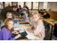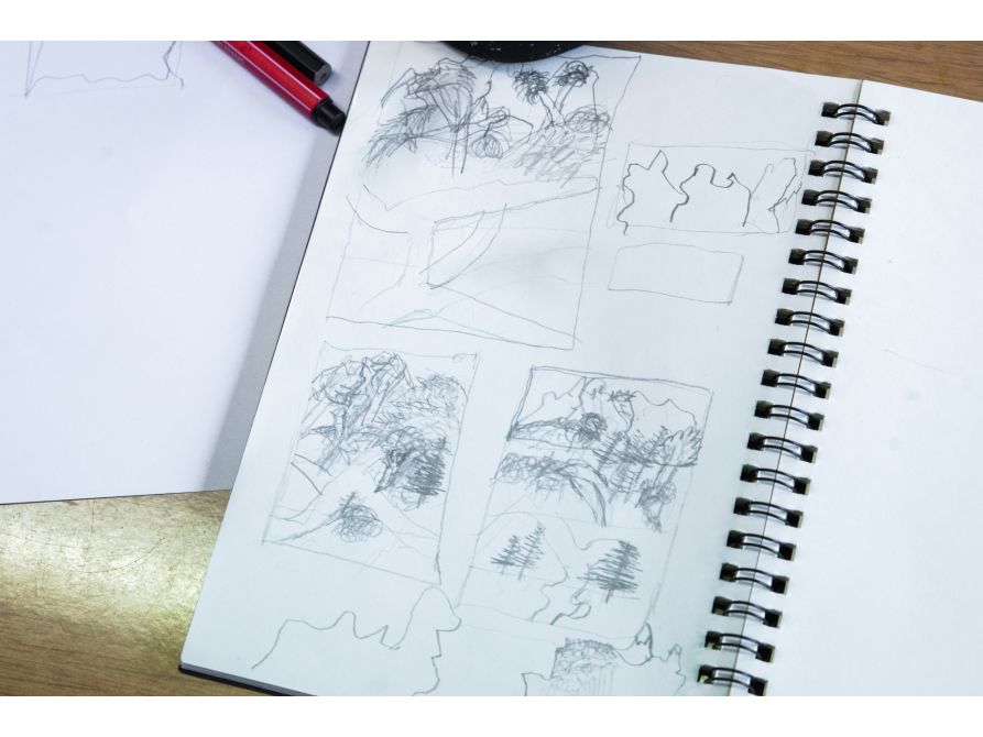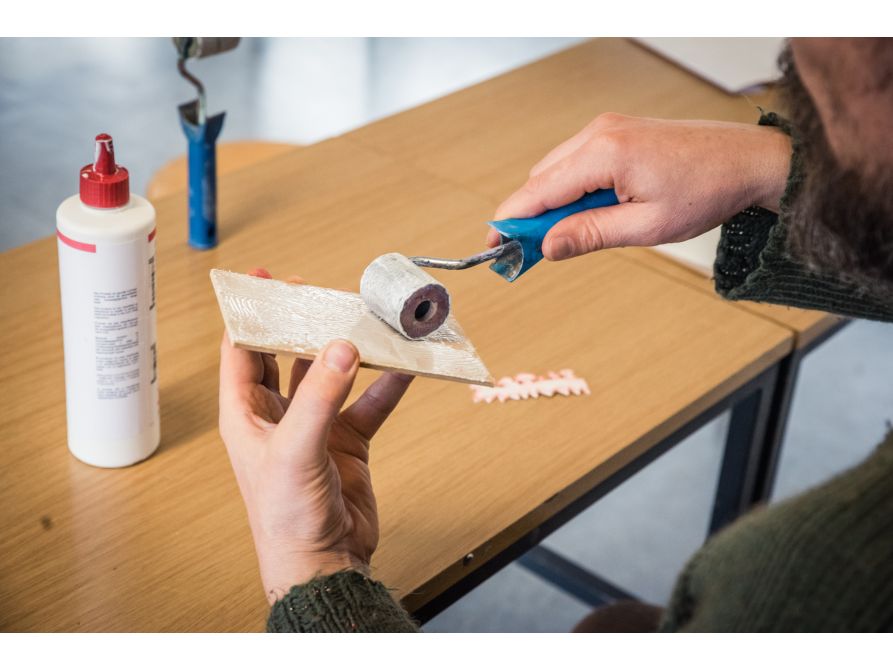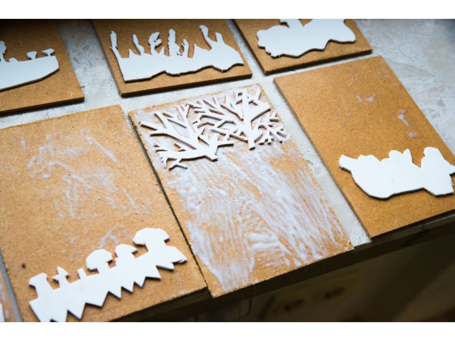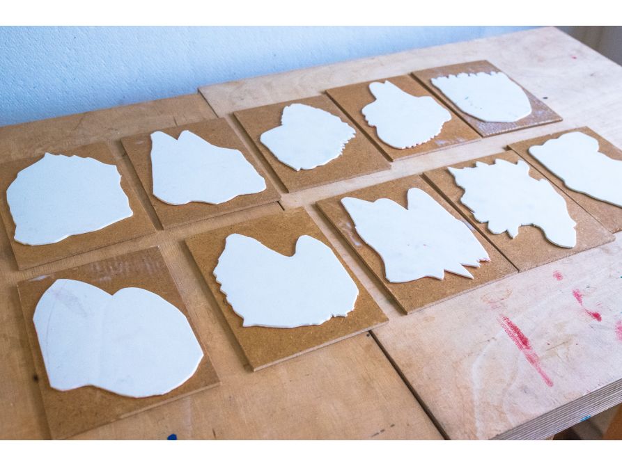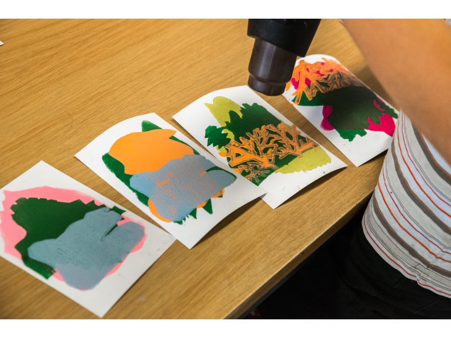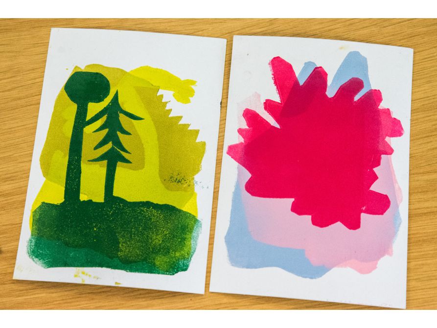 So galt es auch an diesem Tag zunächst die eigene Idee unserer Landschaft in Form von Skizzen zu visualisieren. Der Blick aus dem Fenster machte für Alle die typischen Oberpfälzer Landschaftsformen sichtbar. Aufgeteilt in Hinter-, Mittel- und Vordergrund wurden Formen entworfen, die den verschiedenen Landschaftsebenen entsprachen. Hügel, Berge, Baumkronen, Wiesen, Felder, Seen, Bachläufe bis hin zu Steinen und Blumen mussten in eine reduzierte Bildsprache gebracht werden, um später in Moosgummi ausgeschnitten werden zu können. Der Moosgummi als Druckstempel konnte anschließend farbig auf Papier in Postkartengröße gedruckt werden. Da insgesamt pro Papier vier Ebenen geplant waren, durfte sich jeder Schüler an den Druckstöcken der anderen bedienen, um letztendlich seine Komposition zu erreichen. Ganz nebenbei wurde dadurch der Gemeinschaftsgedanke gestärkt und durch das mögliche Teilen der Fokus auf das Arbeiten im Team gelegt. Aufgrund der reduzierten Formensprache erzielten die Teilnehmer sehr wirkungsvolle und tolle Ergebnisse. Ein gelungener erster Projekttag, der Lust auf mehr machte.