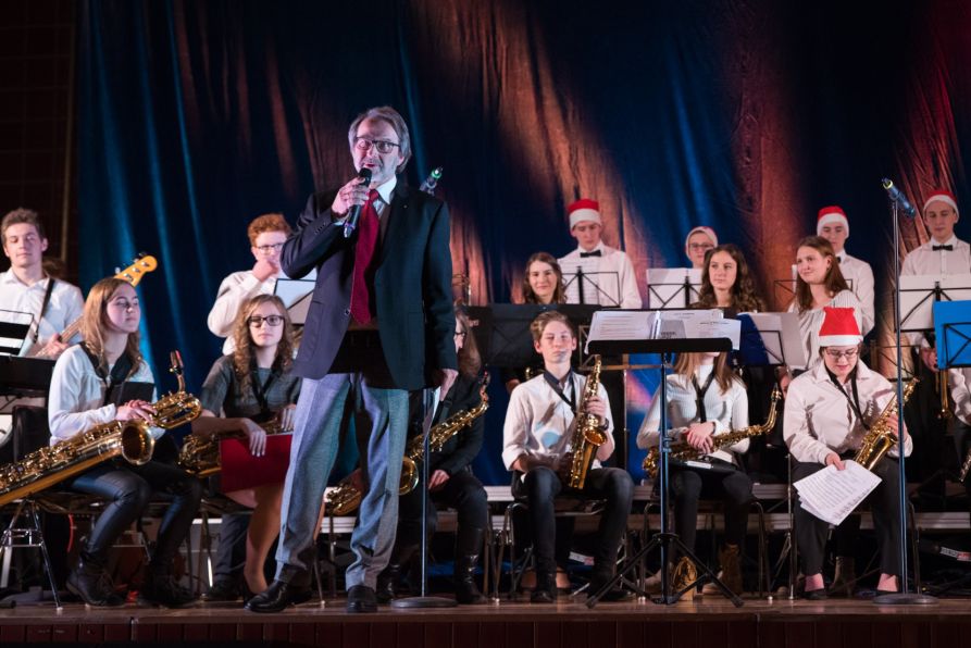 Beim diesjährigen Weihnachtskonzert des Joseph-von-Fraunhofer-Gymnasiums war es endlich so weit: Das "Christkind" des Fördervereins brachte der Big Band (Leitung: Hubert Bauer) die lange gewünschten Bandstands. "Wer sich so professionell anhört wie die Orchester von Glen Miller oder Benny Goodman, der braucht auch optisch ein professionelles Outfit", meinte Fördervereinsvorsitzender StD a. D. Christian Nowotny. "Deshalb bringt das Christkind unseren Musikern aus dem Land des Swing und Jazz heute Abend original amerikanische Bandstands."